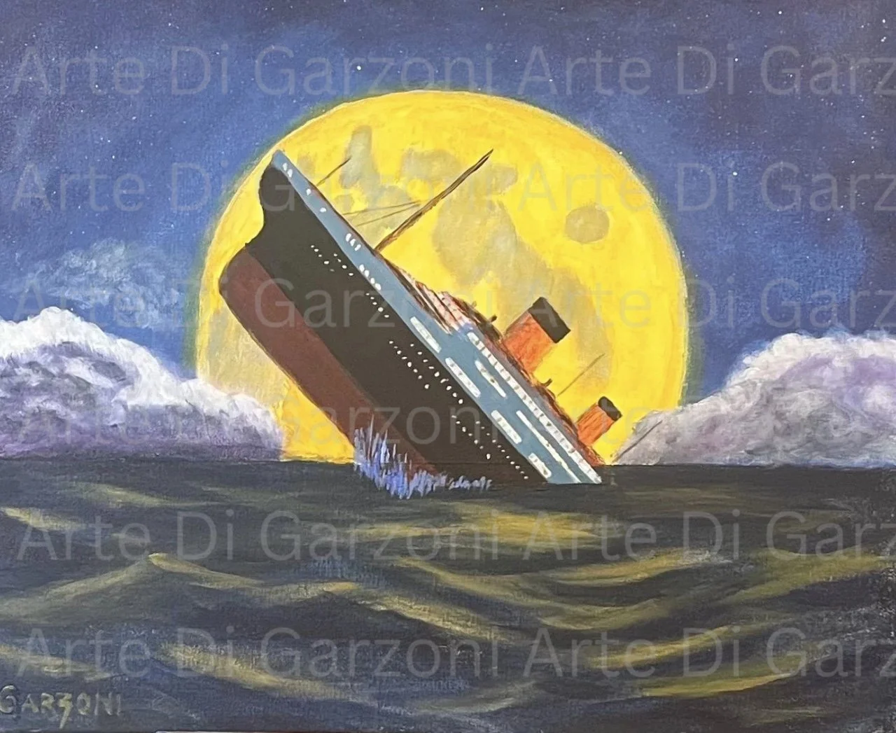Hunter’s Titanic. Acrylic. 16”X24”. Presentation of the sinking of the Titanic in the style of an art deco poster. SOLD.