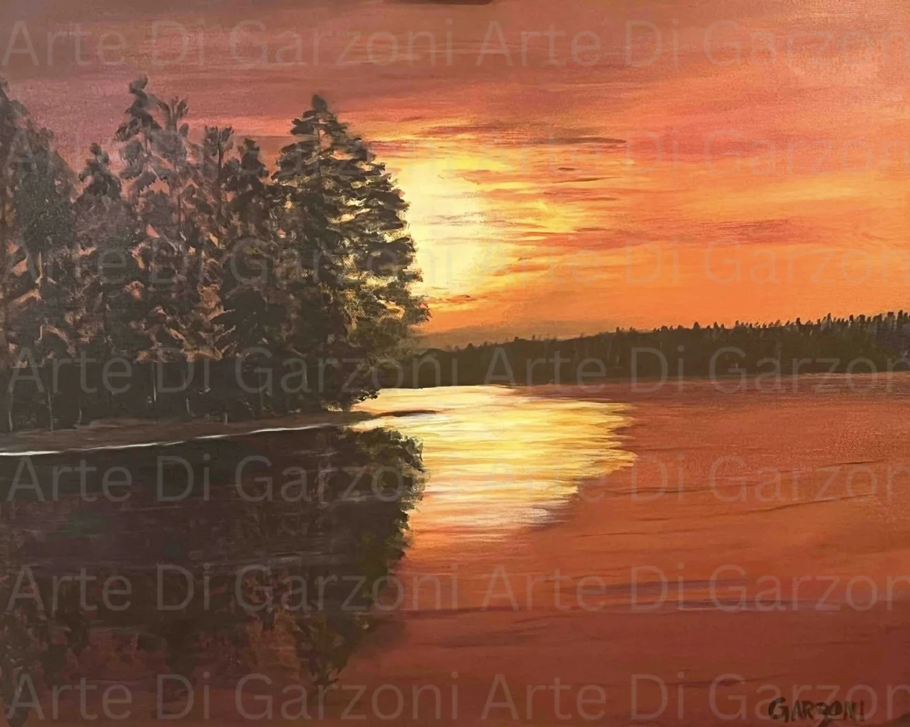 Fire on the Lake. Acrylic. 20X16. Finnish Lake at sunset. $499 +shipping and handling. Framed.